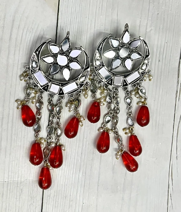 Crescent Shape Mirror-studded Jhumka Red Hanging Stone Earrings